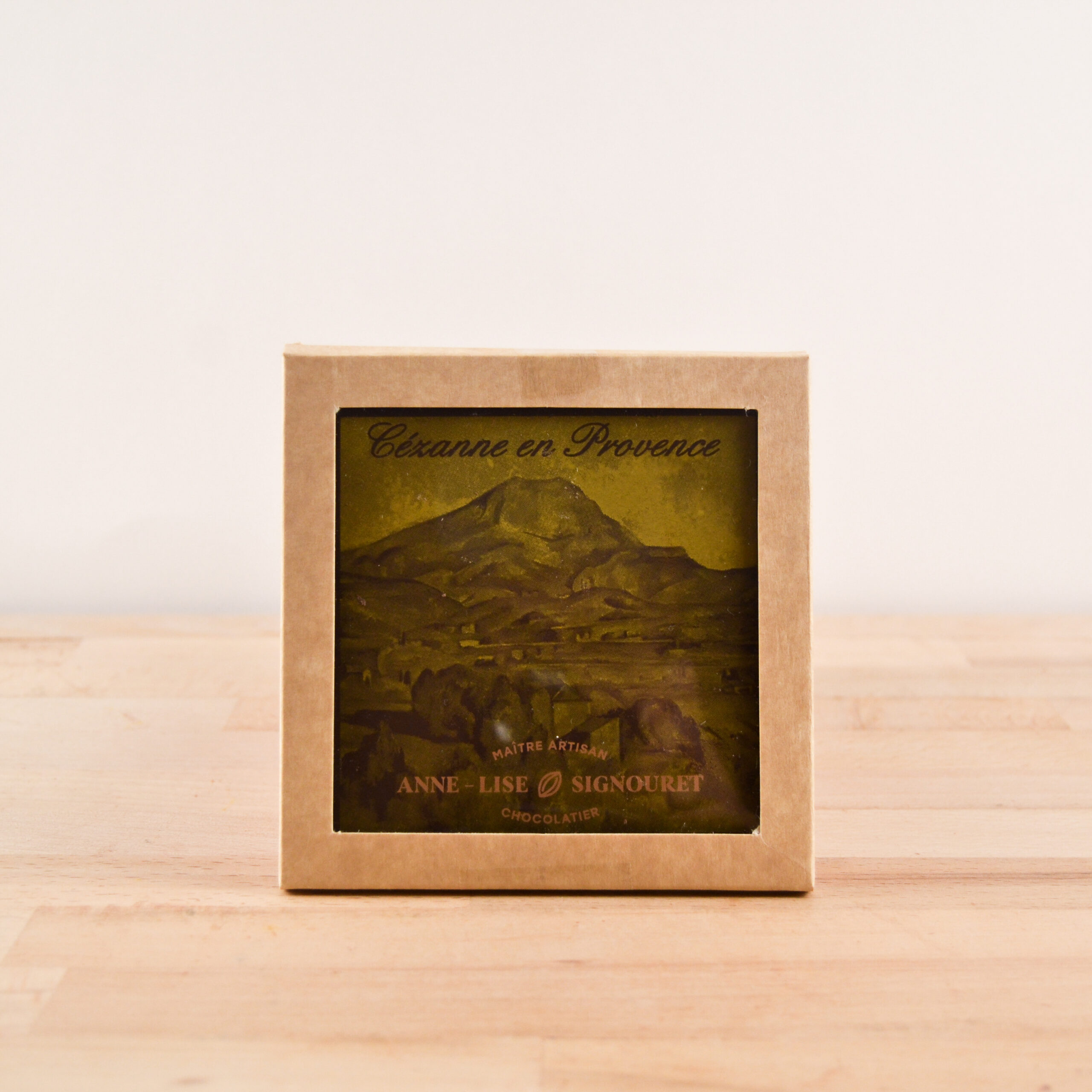 La montagne Sainte-Victoire vue de Bellevue – Une composition vibrante de formes et de couleurs, déclinée en chocolat noir intense et en chocolat au lait 42% gourmand.